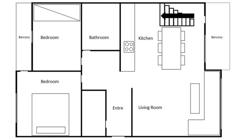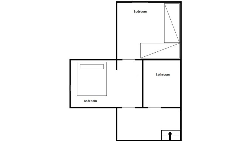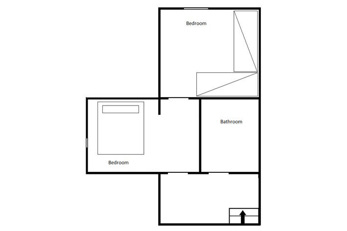 Lägenhet i 2 plan. Allrum med köksavdelning, två sovrum och ett badrum på första våningen, två sovrum och ett badrum på andra våningen.