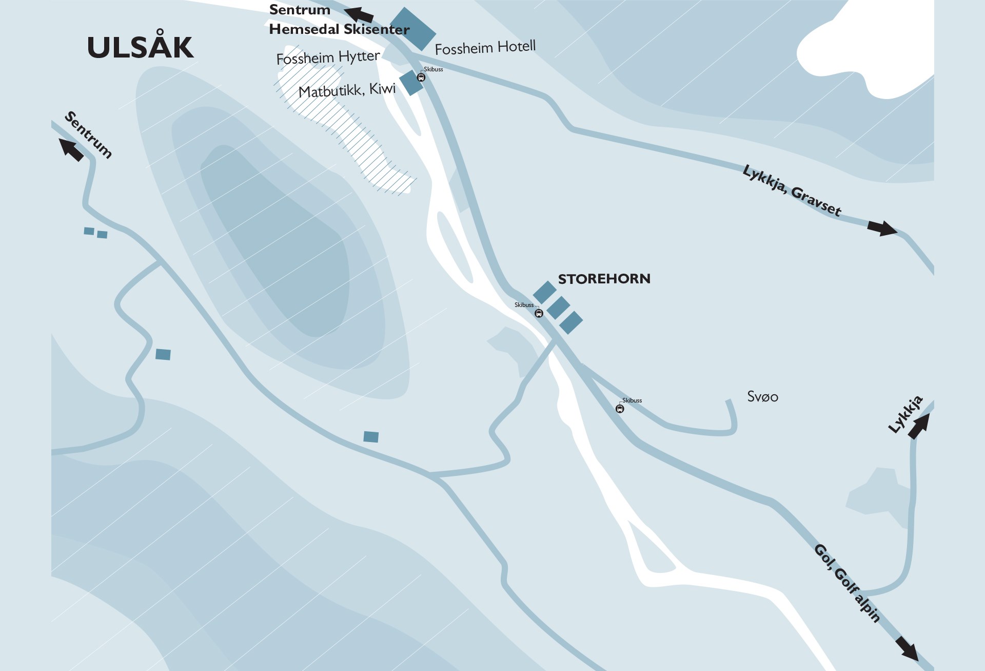 Hemsedal har boenden även runt omkring skidcentrat och byn. I det lilla samhället Ulsåk, som ligger ca 6 km från Hemsedal skicenter hittar ni både restaurang och Hemsedals nyaste mataffär. Till backarna tar ni er enkelt med skidbussarna som går flera gånger vid liftöppning och stängning samt ett antal gånger under dagen och ni åker gratis när ni har ett giltigt liftkort att visa upp. I Ulsåk har ni även närheten till många mils längdskidåkning i området Gravset med preparerade spår.