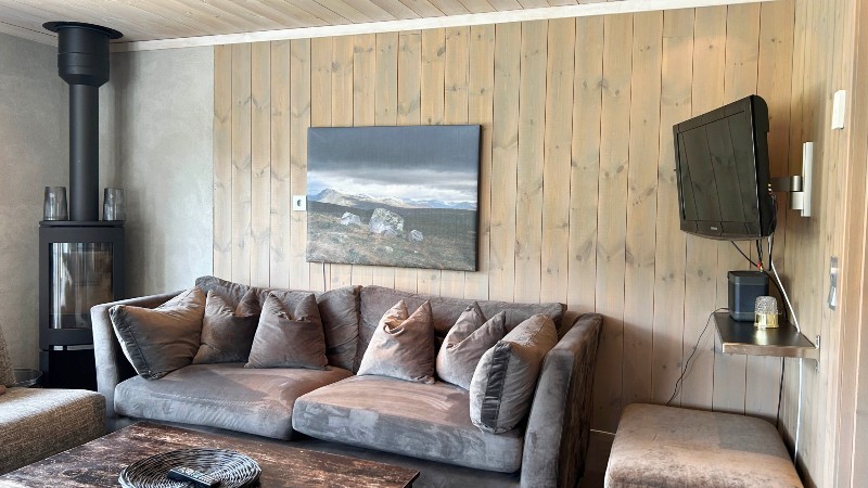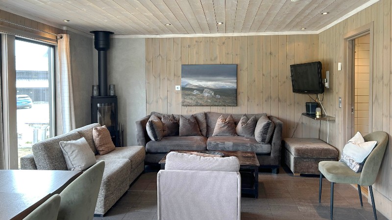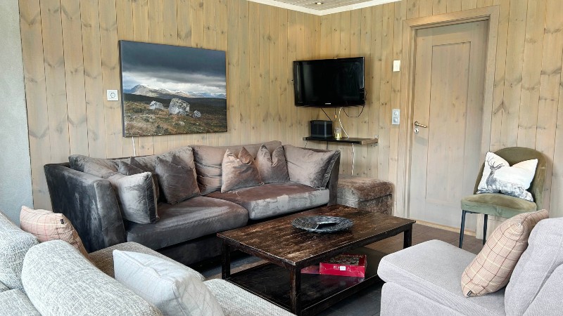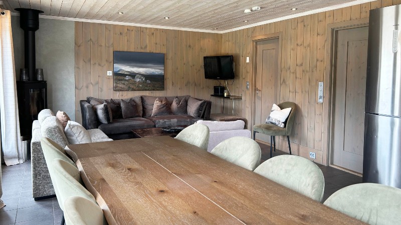Fin, stilfull stuga (del av parstuga) allrum i öppen planlösning med köksavdelning, soffa och öppen spis. 4 sovrum och 2 badrum.