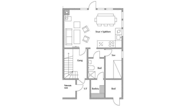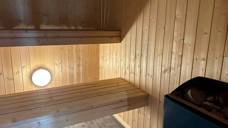 Parstuga med öppen planlösning. Allrum med köksavdelning, fönster från golv till tak, soffa och öppen spis. Allrum, kök, ett sovrum och ett badrum med bastu på entréplan. På andra våningen finns det badrum med bubbelbadkar och tre sovrum.