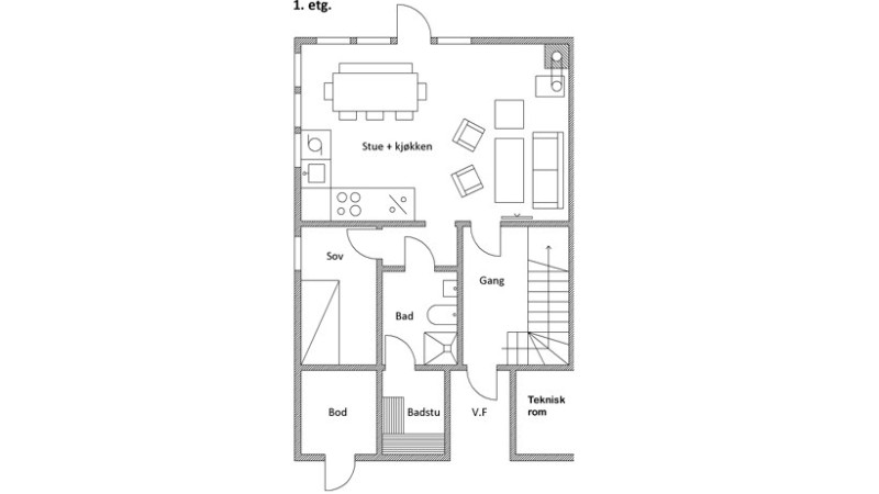 Parstuga med öppen planlösning. Allrum med köksavdelning, fönster från golv till tak, soffa och öppen spis. Allrum, kök, ett sovrum och ett badrum med bastu på bottenvåningen. På andra våningen finns det badrum med bubbelbadkar och tre sovrum.
