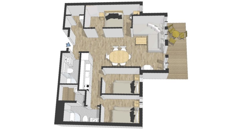 Bilderna här till höger visar lägenhet 205 som ej har mountainview, 3 sovrum, 2 badrum med wc/dusch samt 1 bastu.